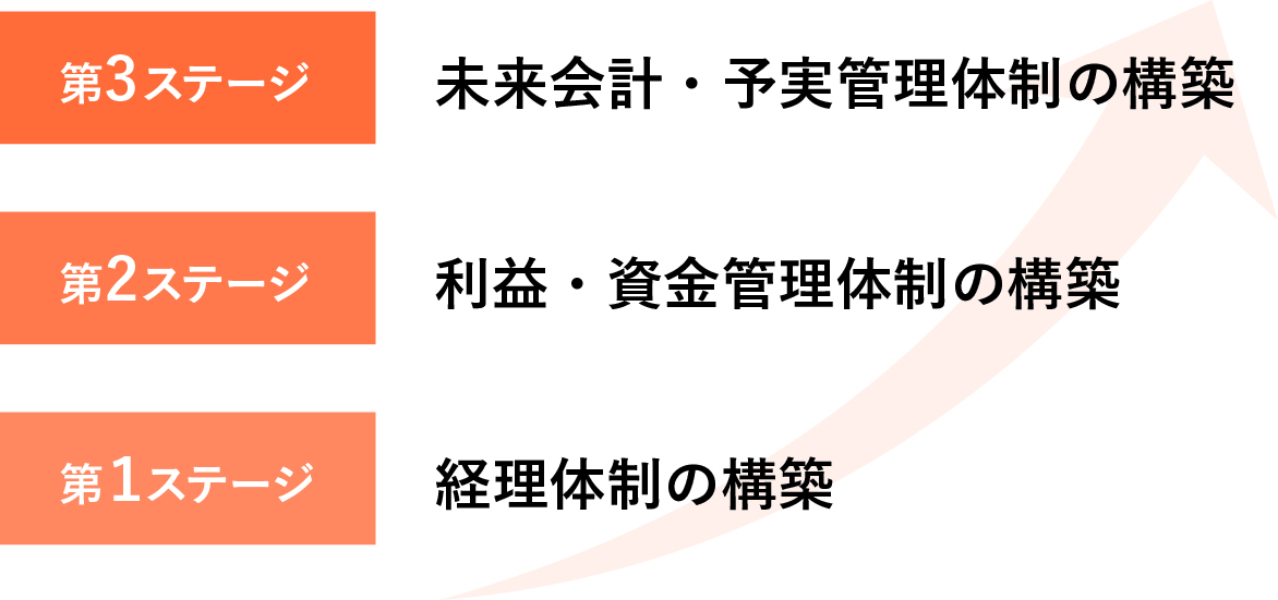 「第一ステージ:経理体制の構築」「第二ステージ:利益・資金管理体制の構築」「第三ステージ:未来会計・予実管理体制の構築」の3ステージで、業務整理、クラウドシステム設定代行、業務アウトソーシング、月次顧問業務、経営計画策定支援などを支援します。お客様の「不安」や「ムダ」を解消し、税理士事務所ならではの安心・確実な経理代行を実現します。